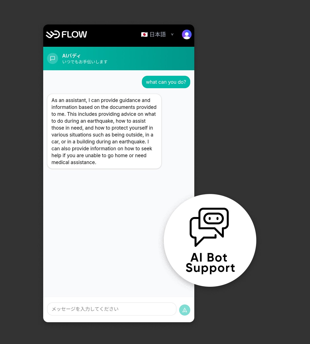 はい。Flowは多言語AIアシスタントを通じて、利用者の母語(英語・中国語・韓国語など)で案内やサポートを行います。日本語が不安なユーザーにも安心して使っていただけます。